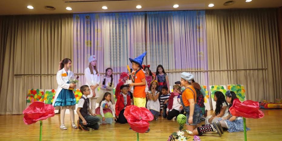Ученики начальных и средних классов подготовили для зрителей замечательный, веселый спектакль «Незнайка и его друзья в Цветочном городе». Море отличной музыки и танцев. Яркие костюмы и декорации. Все дети очень слаженно и дружно играли в спектакле! Без какой-либо видимой помощи взрослых. Они прекрасно исполняли свои роли, полностью вжившись в образы. За всей этой видимой лёгкостью огромный труд завуча-организатора, музыкального работника Смирновой Натальи Ивановны и всего педагогического коллектива ОУ «Русский дом». В конце спектакля на сцену были приглашены все дети, присутствующие в зале. Большим сводным хором они исполнили новогоднюю песню, слова которой они выучили заранее.