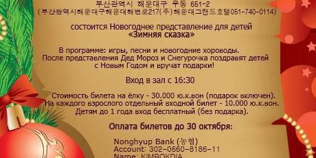 Дорогие родители! НОВОГОДНЯЯ ЁЛКА в Пусане состоится 17 декабря в 17:00! Обратите, пожалуйста, внимание, что билеты на праздник необходимо выкупить до конца октября. До встречи на русской «Зимней сказке»!