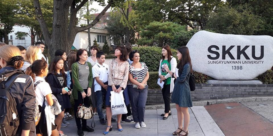 22 сентября 2016 года ученики Русской Академии «Новый путь» и ОУ «Русский дом» вместе с учителями посетили сеульский кампус университета. Гостей принимало отделение русского языка и литературы. Под руководством доцента Поповой Е.В. студентами отделения для ребят была подготовлена увлекательная экскурсия на русском языке по исторической части – древней конфуцианской акадении Сонгюнгван – и современному кампусу университета. Ребята узнали об истории создания университета, а некоторые даже сохранили листья от шестьсотлетних деревьев гинго, растущих на территории университета, в качестве сувенира. :) По легенде, под такими деревьями учил Конфуций, поэтому они особо почитаются в конфуцианстве.