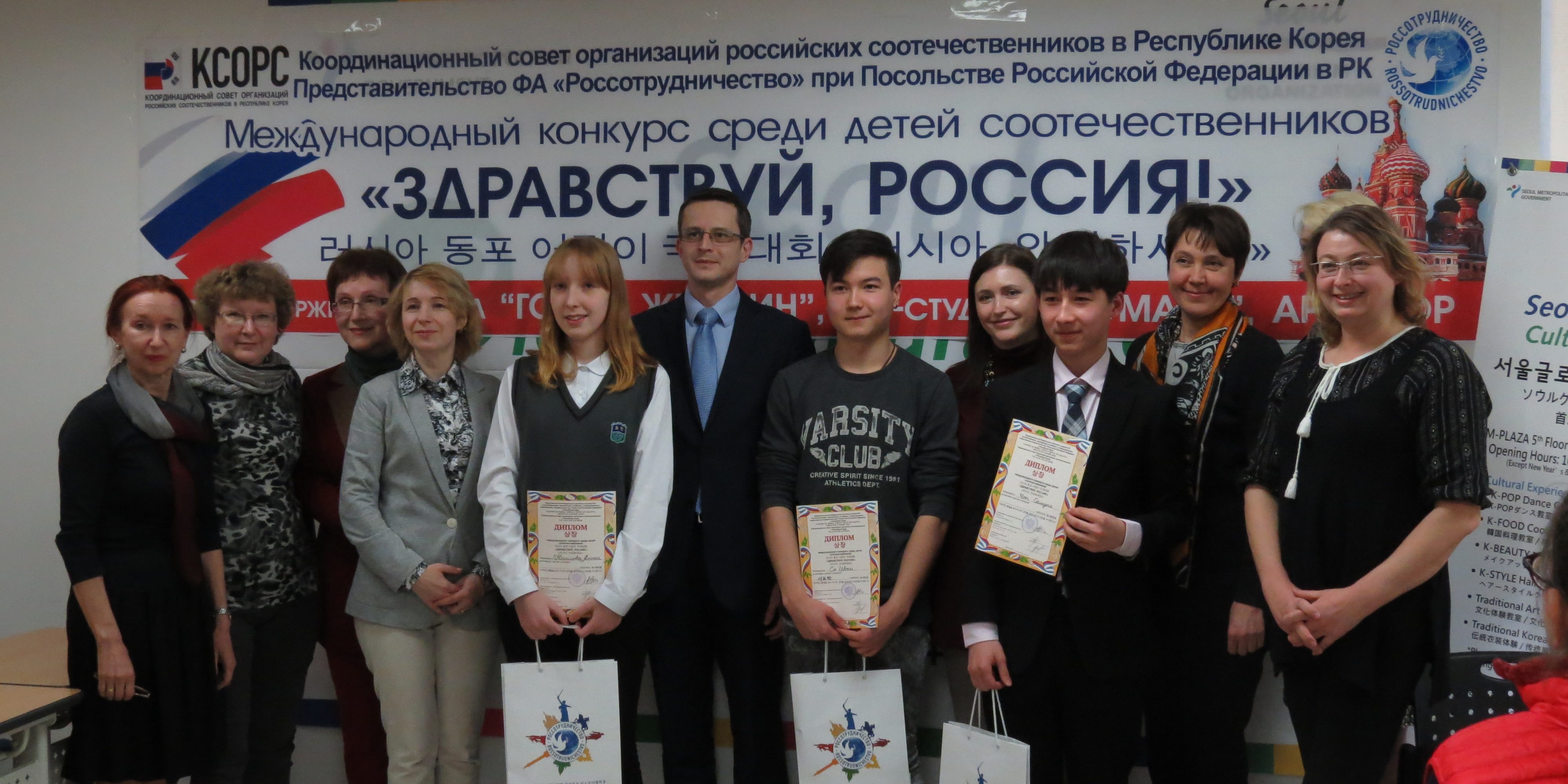 26 марта в Сеуле прошел финальный отборочный тур конкурса молодых соотечественников 14-19 лет на знание русского языка, культуры и истории «Здравствуй, Россия!». Федеральное агентство «Россотрудничество» реализует программу учебно-образовательных поездок по историческим местам России «Здравствуй, Россия!» по всему миру с 2014 года. Несмотря на то, что в Республике Корея такой конкурс проходил впервые, он вызвал сразу интерес у школьников и студентов. В первом туре было получено много видео презентаций от желающих участвовать в конкурсе на тему «Почему я хочу поехать в Россию». В решающем туре ребята приготовили презентации на тему «Славные страницы истории России». Среди конкурсантов были ребята, которые обучаются по программе как российских, так и корейских учебных заведений. Критерии оценок для каждой группы были разные – обязательно учитывалось то, что подросткам, обучающимся в корейских школах, труднее было выступать на русском языке. Всем ребятам, прошедшим во второй тур были вручены дипломы участника и памятные подарки, а определившимся в финале четверым победителям наряду с дипломами и подарками вскоре в торжественной обстановке, в Посольстве РФ в РК будет вручен главный приз — путевка в Москву, в учебно-образовательную поездку, которая состоится в августе 2016 года. Вручал награды представитель ФА «Россотрудничество» Буробин Денис Сергеевич. В поездку отправятся ребята, продемонстрировавшие великолепные знания по истории России и хорошо владеющие русским языком.