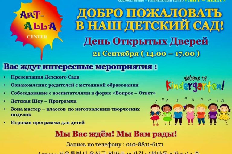21 сентября (суббота) состоится открытие нового русского детского сада «Арт-Алла» в Сеуле! «Арт-Алла» — это детский сад с…