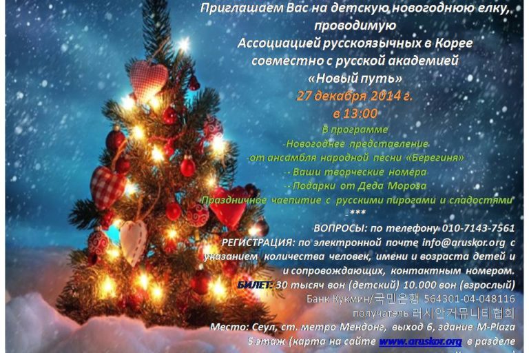 ДЕТСКИЕ НОВОГОДНИЕ И РОЖДЕСТВЕНСКИЕ МЕРОПРИЯТИЯ 2014 В КОРЕЕ Дата Время Мероприятие Место Организатор Контакты Примечания Новогоднее сказочное…